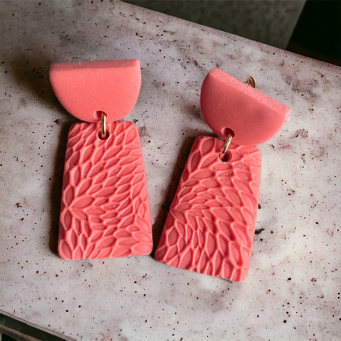 Handgemaakte oorbellen gemaakt van polymeerklei en hypoallergene chirurgische vergulde roestvrijstalen kogelknoppen voor gevoelige oren.