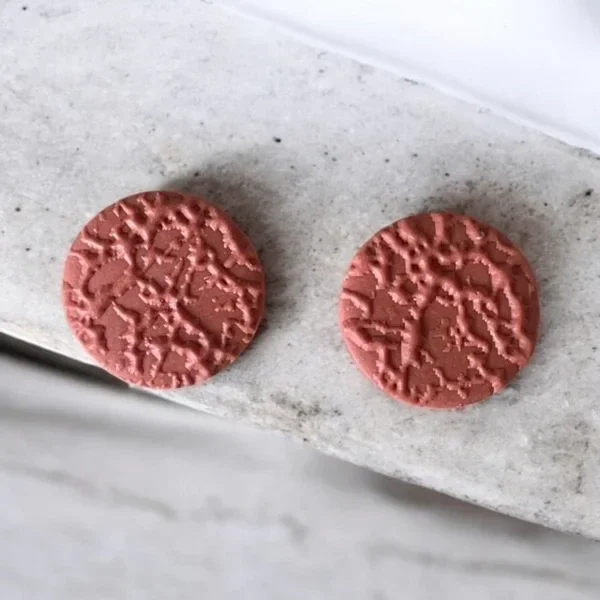 Handgemaakte oorbellen gemaakt van polymeerklei en hypoallergene chirurgische vergulde roestvrijstalen kogelknoppen voor gevoelige oren.