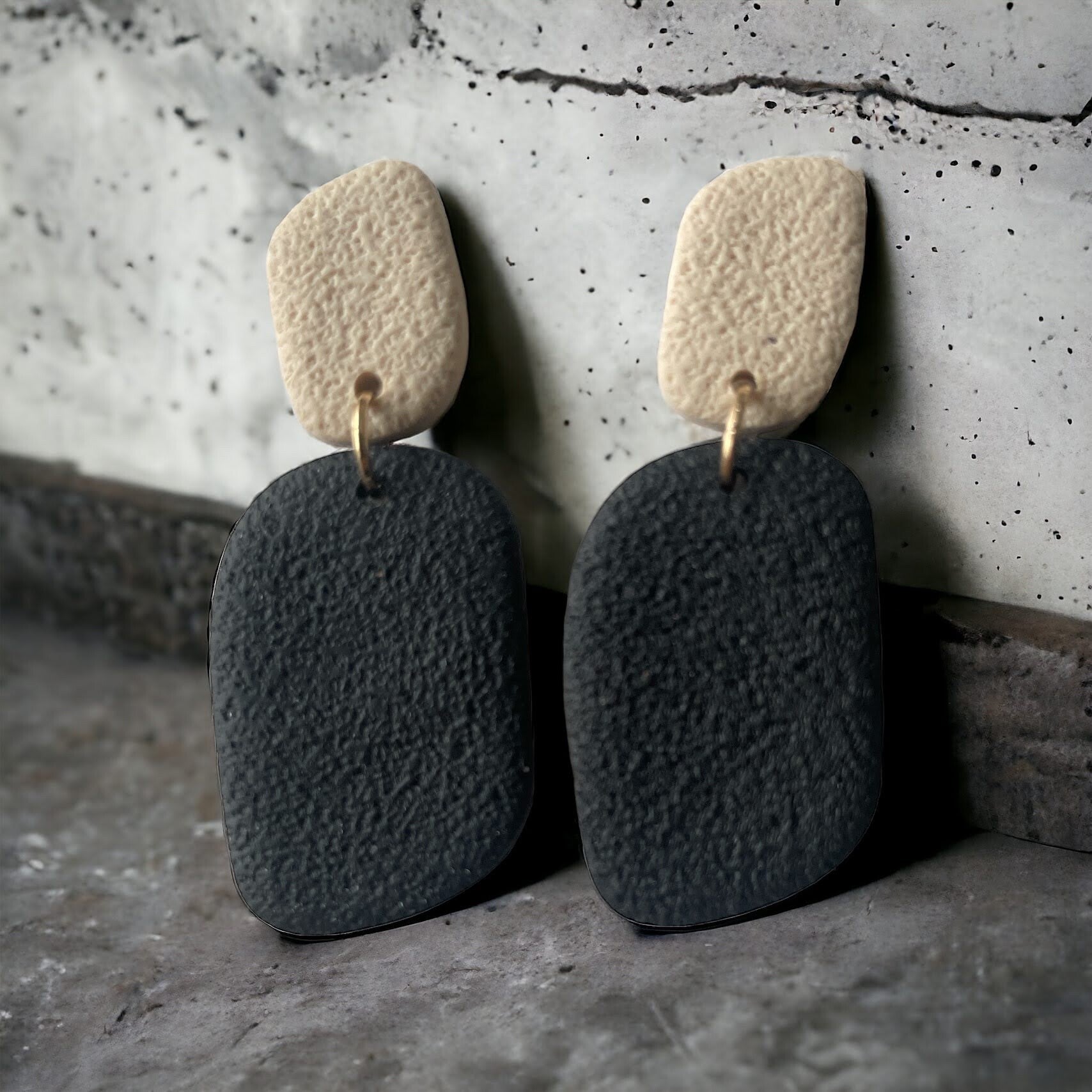 Handgemaakte oorbellen gemaakt van polymeerklei en hypoallergene chirurgische vergulde roestvrijstalen kogelknoppen voor gevoelige oren.
