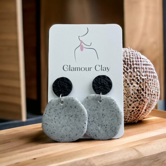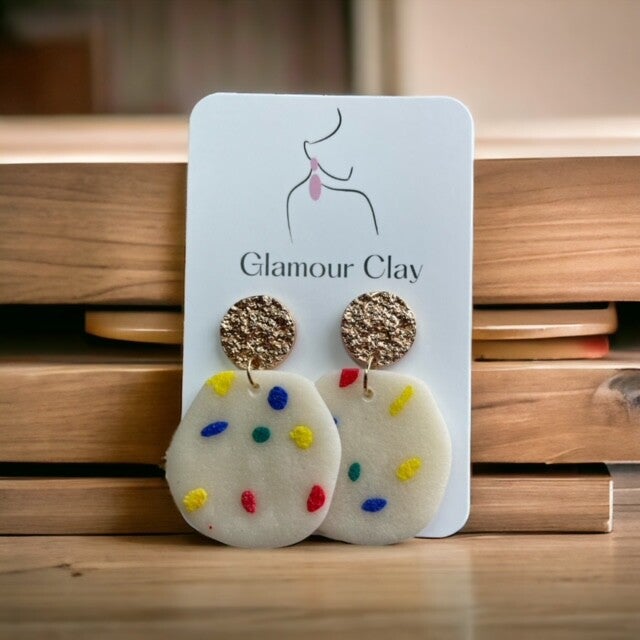 Handgemaakte oorbellen gemaakt van polymeerklei en hypoallergene chirurgische vergulde roestvrijstalen kogelknoppen voor gevoelige oren.
