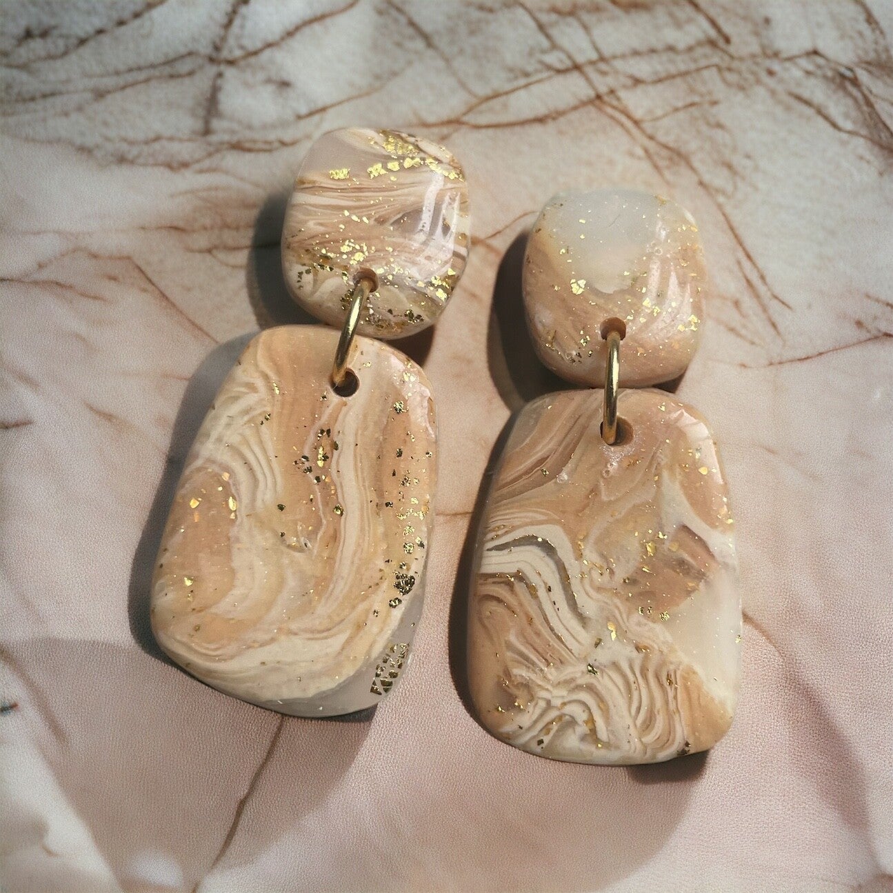 Handgemaakte oorbellen gemaakt van polymeerklei en hypoallergene chirurgische vergulde roestvrijstalen kogelknoppen voor gevoelige oren.